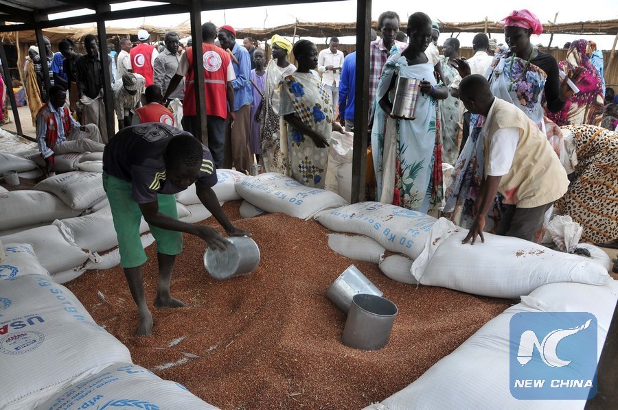 Refugees from South Sudan get foods at the Khour Al-Waral refugee camp in Al-Salam locality, some 69-kilometers south of Rebek, capital of White Nile State, Sudan, May 18, 2017. The Khour Al-Waral refugee camp accommodated 50,000 refugees. The majority of them are from Upper Nile State of South Sudan on the border with Sudan. (Xinhua/Mohamed Babiker)