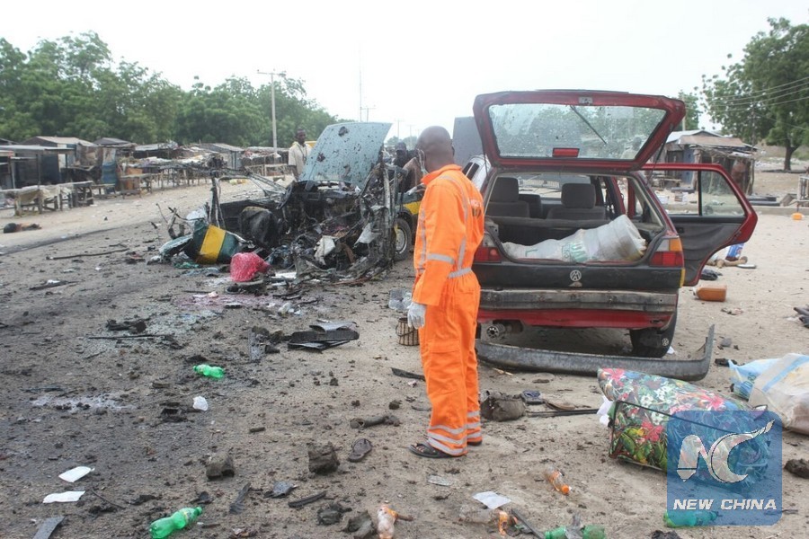 File photo provided by Nigeria's National Emergency Management Agency (NEMA) shows the explosion site near a local motor park in Maiduguri, northeastern Nigeria, on Oct. 12, 2016. (Xinhua/NEMA)