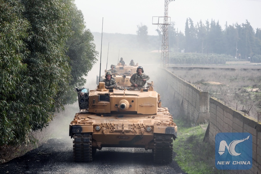Turkish armored vehicles head toward Syria's Afrin district from Hatay, Turkey, on Jan. 21, 2018. (Xinhua)