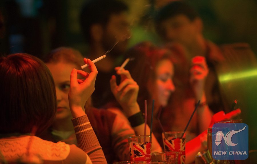 File photo taken on May 30, 2014 shows girls smoking in a bar in central Moscow. (Xinhua/AFP)