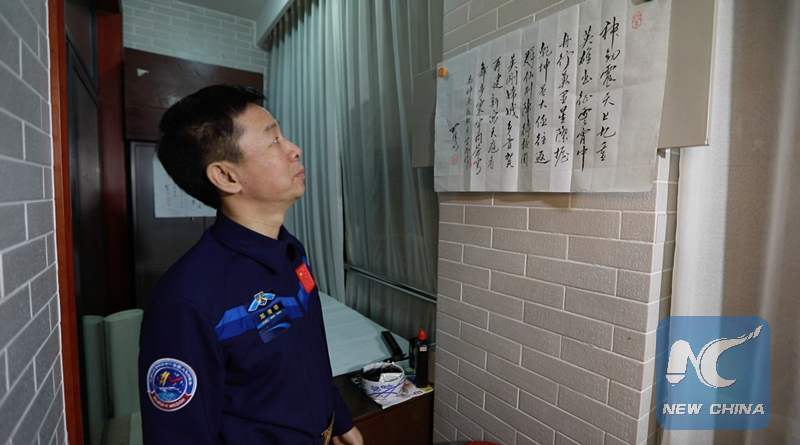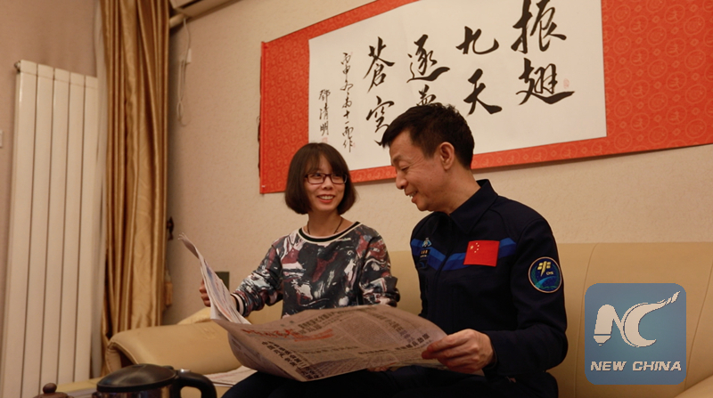 Deng Qingming and his daughter Deng Manqi (L). On the wall is the father's calligraphy, which says, "Fly to the sky; Chase the space dream". (Xinhua photo)