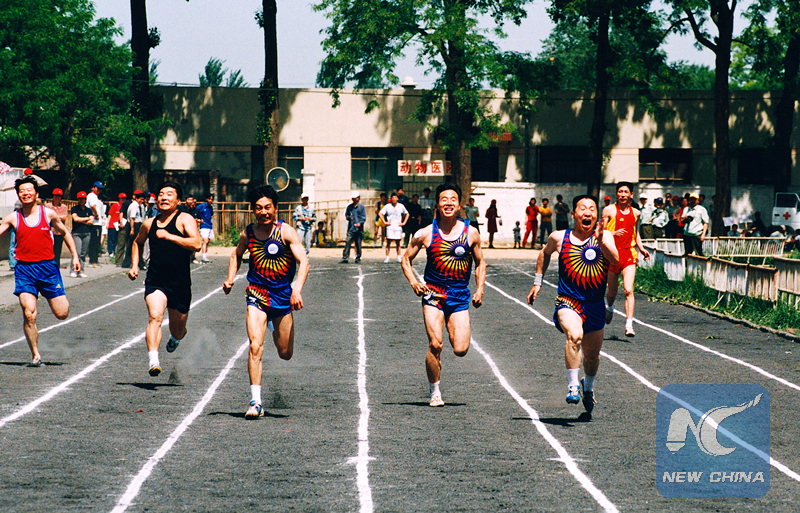 Zhao Chuandong, Yang Liwei, and Jing Haipeng race in a sports meeting in 2002. (photo by Zhu Jiutong)