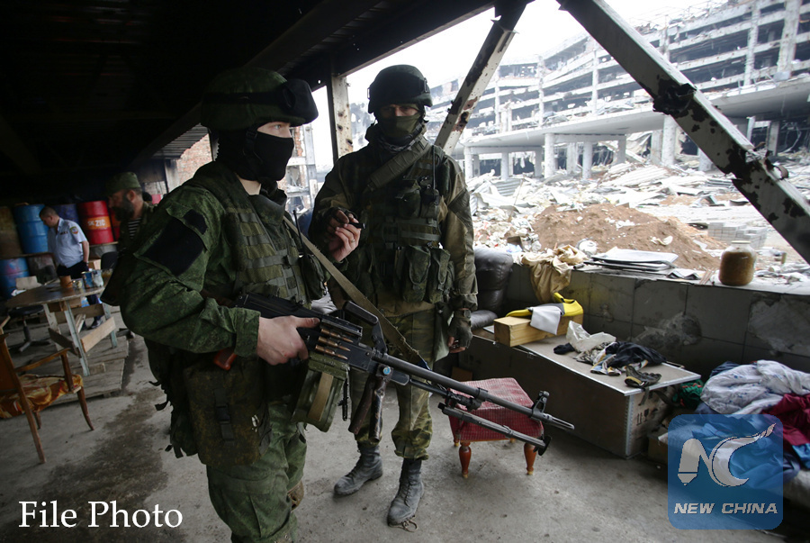 An armed pro-Russian separatist of the self-proclaimed Donetsk People's Republic (DNR) walks in front of the destroyed Donetsk International Airport, in Donetsk, on June 1, 2016. (Xinhua/AFP)