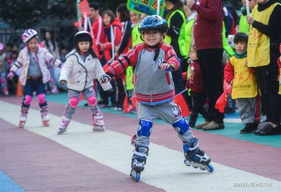 Children race roller blading at a kindergarten in Changxing County of east China's Zhejiang Province, Dec. 12, 2017. Diversified sportive activities were organized to welcome the coming new year of 2018. (Xinhua/Xu Yu)