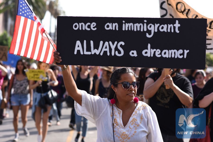 People protest efforts by the Trump administration to phase out DACA (Deferred Action for Childhood Arrivals) which provides protection from deportation for young immigrants brought into the U.S. illegally by their parents, Sept. 10, 2017 in Los Angeles, California. (Xinhua/AFP)