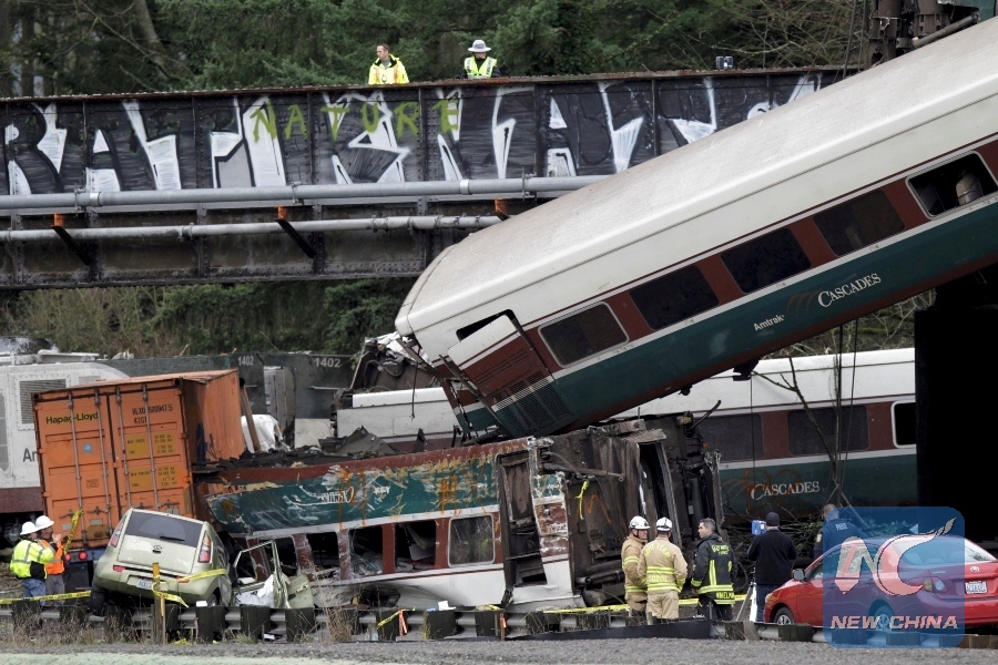 File photo shows the scene where an Amtrak passenger train derailed on a bridge over interstate highway I-5 in DuPont, Washington, U.S. on December 18, 2017. (Xinhua/REUTERS)