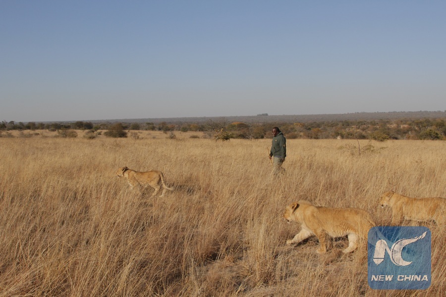 Staff members lead lion cubs out for a lion walk at the Antelope Park, in Gweru, Zimbabwe, Aug. 14, 2016. Lion walk was introduced to Antelope Park over a decade ago as part of an on-going conservation program to save African lions. Only cubs aged below 18 months are taken for lion walk. Once they grow older, human interaction is limited. (Xinhua/Zhang Yuliang)