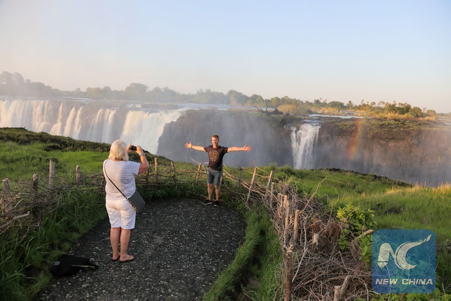 Tourists take photos in front of the Victoria Falls during dry season near the Zambia-Zimbabwe border on Dec. 11, 2015. Dry season of the Victoria Falls lasts generally from October to next February. (Xinhua/Xu Lingui)