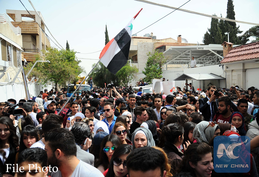People attend a protest against last week's U.S. airstrikes on Syria, in front of the UN office in Damascus, capital of Syria, April 11, 2017. (Xinhua/Ammar Safarjalni)