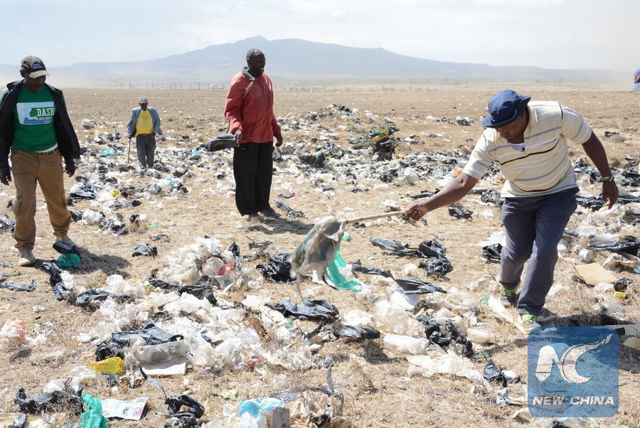 File photo shows residents of Mirera Estate going about a cleanup exercise near Lake Naivasha, Kenya, Aug. 21, 2017. The country effecutated the ban on plastic bags in 2017. (Xinhua/Robert Manyara)
