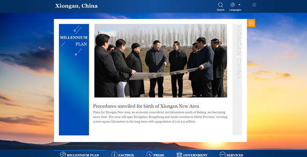 The establishment of the Xiongan New Area is a major historic and strategic decision crucial for the millennium to come. It is on a mission to create an exemplar of world-class city cluster in China. The official website, a new platform that combines the functions of website, television, radio, and newspaper, has undertaken the responsibility of preserving the moments of our times and showcasing the new area's image.