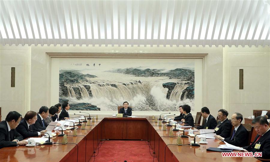Zhang Dejiang (C), chairman of the National People's Congress (NPC) Standing Committee, presides over a meeting of the chairman and vice-chairpersons of the NPC Standing Committee, in Beijing, capital of China, Feb. 23, 2018. (Xinhua/Liu Weibing)