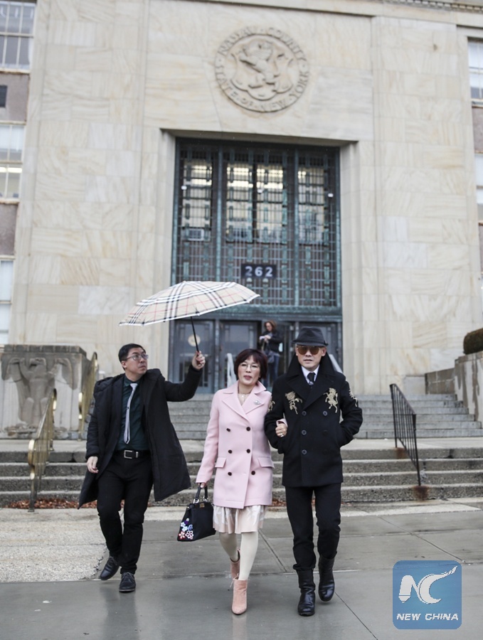 Zhou Libo (2nd L) walks out of the Nassau County Court after a court session in Nassau County, New York, the United States, on Feb. 22, 2018. (Xinhua/Wang Ying)