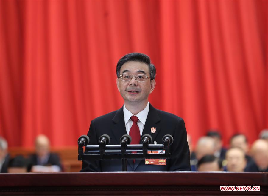 Chief Justice Zhou Qiang delivers a work report of the Supreme People's Court at the second plenary meeting of the first session of the 13th National People's Congress at the Great Hall of the People in Beijing, capital of China, March 9, 2018. (Xinhua/Wang Ye)