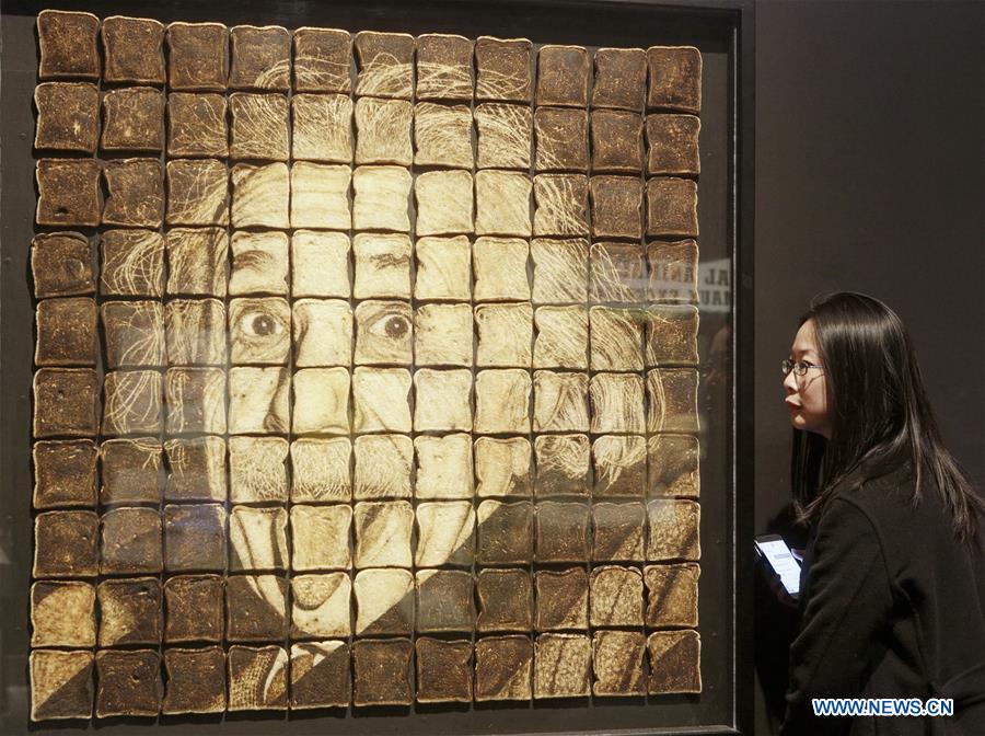 A visitor takes a look at the portrait of Albert Einstein that built by bread toasts at the "Science of Ripley's Believe It or Not!" exhibition at Science World in Vancouver, Canada, March 9, 2018. As part of its North American tour, the exhibition showcases all kinds of curious objects, artifacts and science findings that people can learn and question about. (Xinhua/Liang Sen)