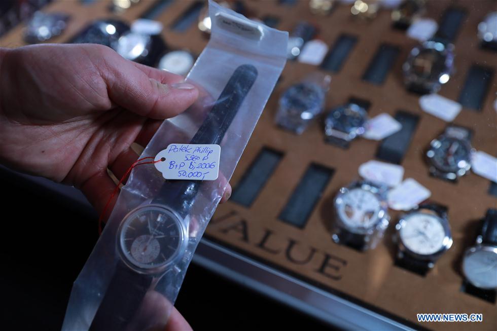 An exhibitor shows a Patek Philippe watch at the 18th Watch & Jewelery Exchange Fair in Frankfurt, Germany, March 11, 2018. Some 60 international exhibitors attended the fair, which attracted around 950 watch experts and collectors. (Xinhua/Luo Huanhuan)