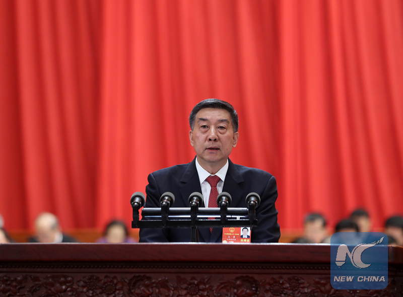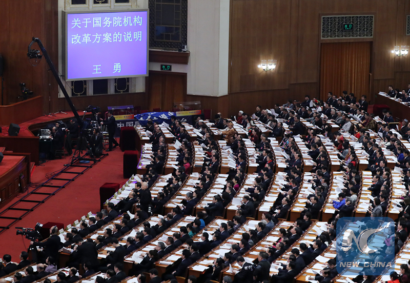 Chinese State Councilor Wang Yong delivers an institutional restructuring plan of the State Council at the fourth plenary meeting of the first session of the 13th National People's Congress (NPC) at the Great Hall of the People in Beijing on March 13, 2018. (Xinhua/Wang Ye)