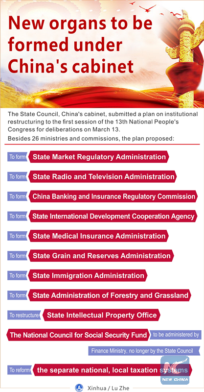 The graphic shows new organs to be formed under the State Council, China's cabinet, according to a plan on institutional restructuring submitted to the first session of the 13th National People's Congress for deliberations on March 13, 2018. (Xinhua/Lu Zhe)