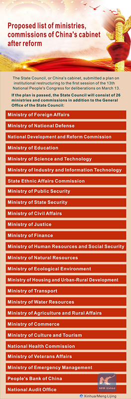 The graphic shows a plan on institutional restructuring submitted by the State Council, or China's cabinet, to the on-going first session of the 13th National People's Congress for deliberations on March 13, 2018. (Xinhua/Meng Lijing)