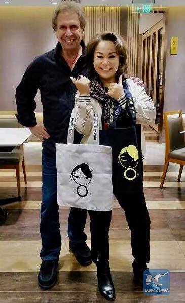 Rick O'Shea and Chinese singer Teresa Carpio modeling Babei bags in Beijing, 2017. (Photo provided by Rick O'Shea)