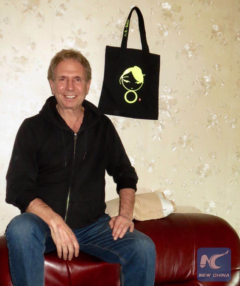 Rick O'Shea in his Beijing apartment next to a Babei bag, Feb. 28, 2018. (Photo provided by Tamara Treichel and Liu Bowei)