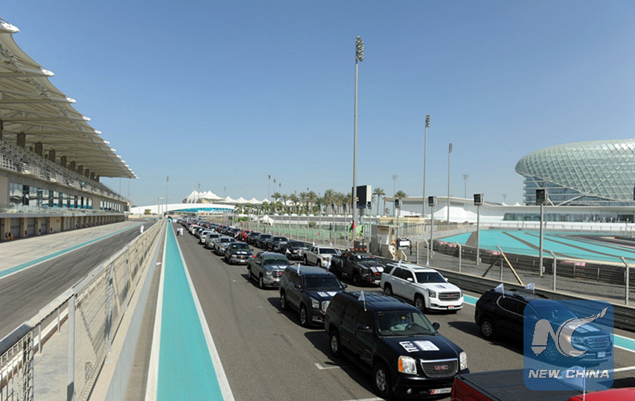 A total of 191 GMC vehicles took part in a record-breaking four-km car parade held on the Formula One race track in Abu Dhabi, UAE on 13 March, 2018. (Xinhua/Performance Communications)