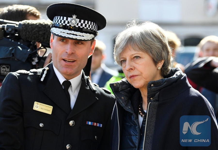 Britain's Prime Minister Theresa May (R) talks with Wiltshire Police's Chief Constable Kier Pritchard in Salisbury, southern England, on March 15, 2018, as she is shown the area where former Russian double agent Sergei Skripal and his daughter Yulia were discovered on March 4, following an apparent nerve agent attack. (Xinhua/AFP)