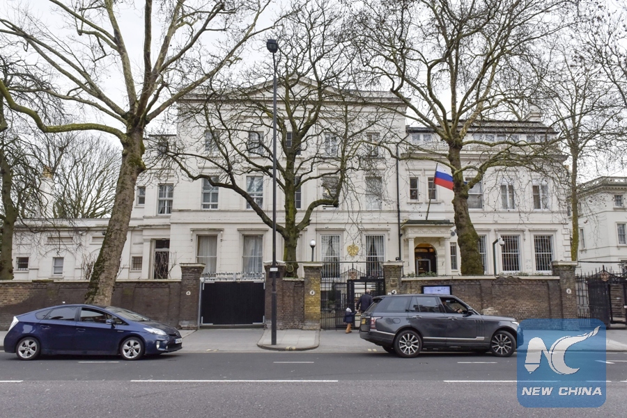 Photo taken on March 14, 2018 shows a general view of the exterior of the Russian Embassy in London, Britain. British Prime Minister Theresa May on Wednesday announced a series of measures against Russia over its failure to respond to demands by the British government to explain how a military-grade nerve agent was used in a recent attack on former Russian spy Sergei Skripal and his daughter. (Xinhua/Stephen Chung)
