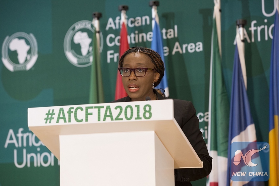 Vera Songwe, Under-Secretary-General of UN and Executive Secretary of the UN Economic Commission for Africa, speaks during an African Union (AU) Executive Council meeting in Kigali, capital city of Rwanda on March 19, 2018. UN and AU officials on Monday urged African countries to take more measures as Africa is launching the African Continental Free Trade Area (AfCFTA). (Xinhua/Gabriel Dusabe)