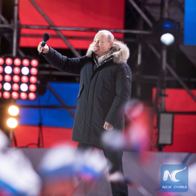 Incumbent Russian President Vladimir Putin gestures to people at an occasion in Moscow, Russia, on March 18, 2018. Incumbent Russian President Vladimir Putin was set to win his fourth term as he got 75.91 percent of the votes after 70 percent of the ballots were counted, preliminary data from the Central Election Commission (CEC) showed. (Xinhua/Wu Zhuang)