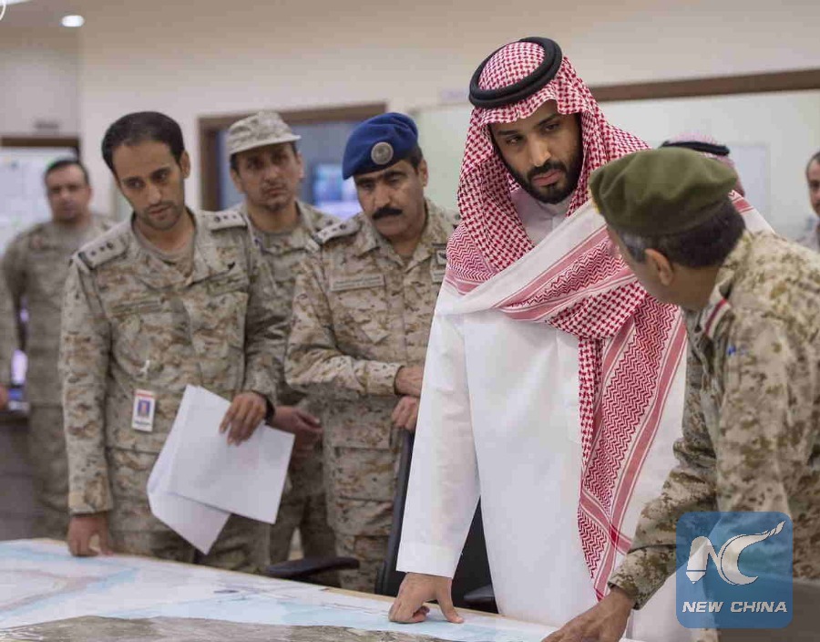 Saudi Arabian Defense Minister Mohammed Bin Salman (2nd R) listens to briefing by military officers on the operation at the military operation center in the country's southern area bordering Yemen, March 25, 2015. (Xinhua/SPA)