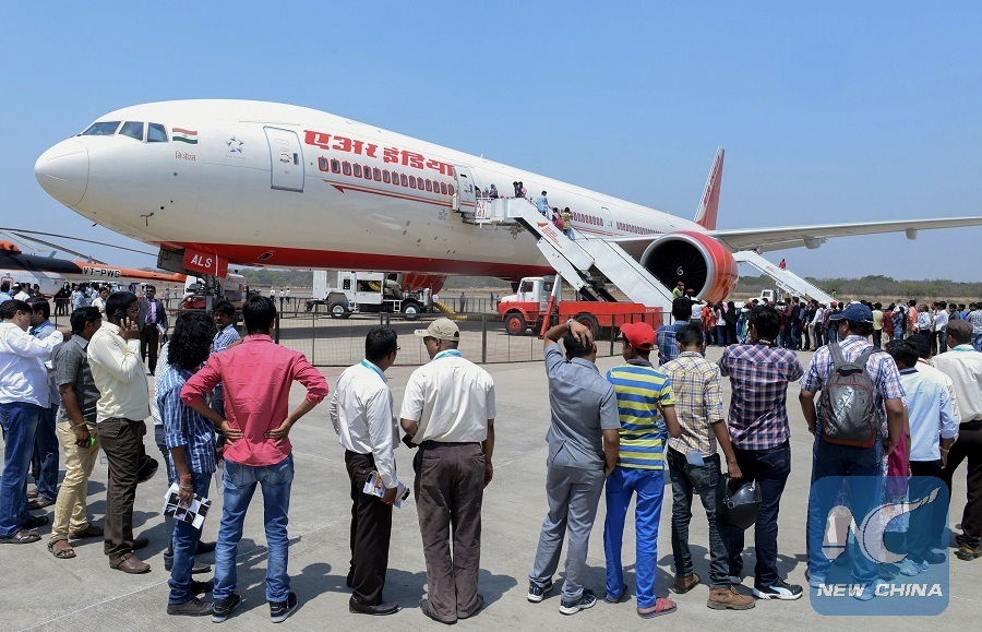 Visitors line up to enter an Air India Boeing 777 on display during the IndiaAviation 2016 airshow at Begumpet airport in Hyderabad. (AFP Photo)