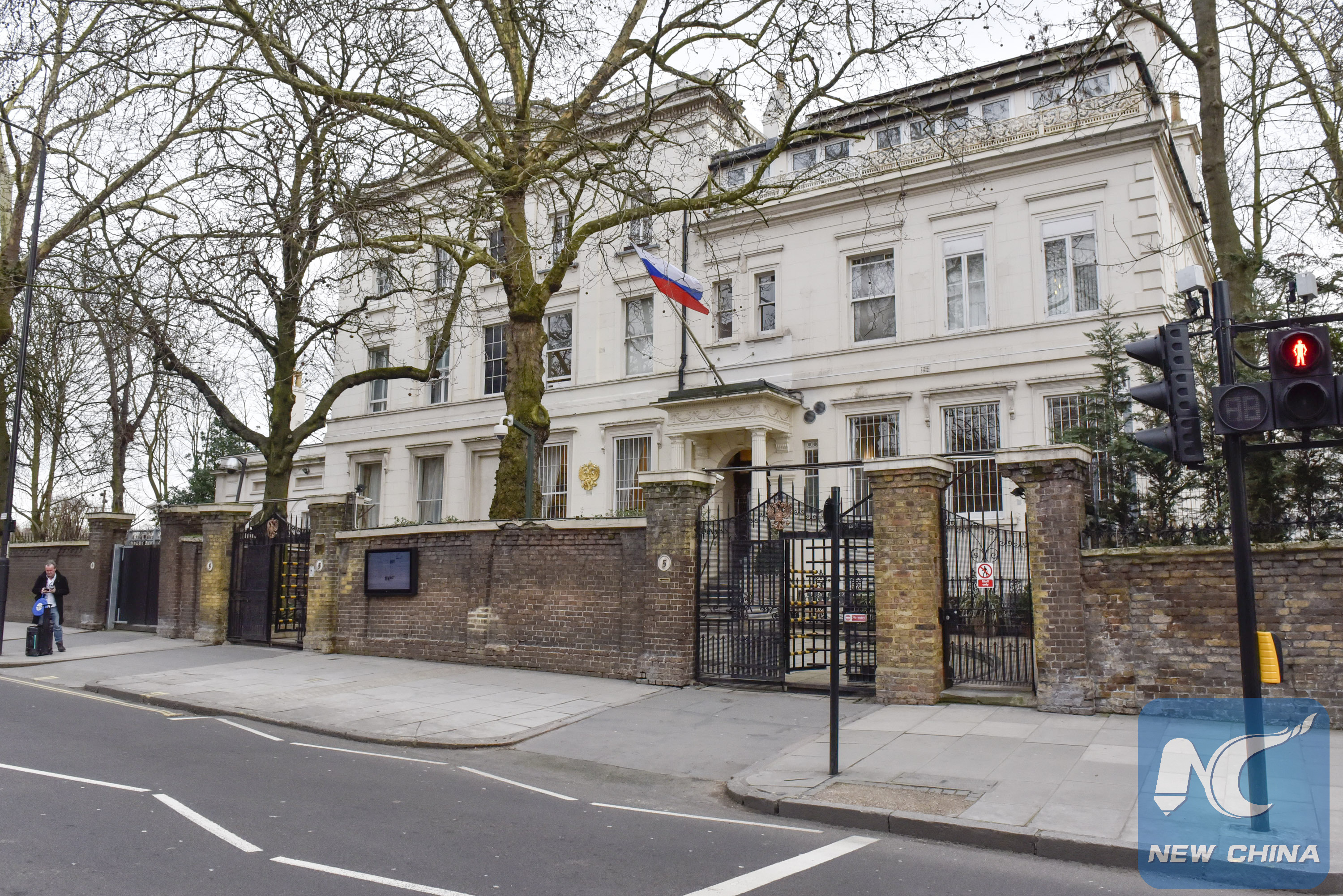Photo taken on March 14, 2018 shows a general view of the exterior of the Russian Embassy in London, Britain. (Xinhua/Stephen Chung)