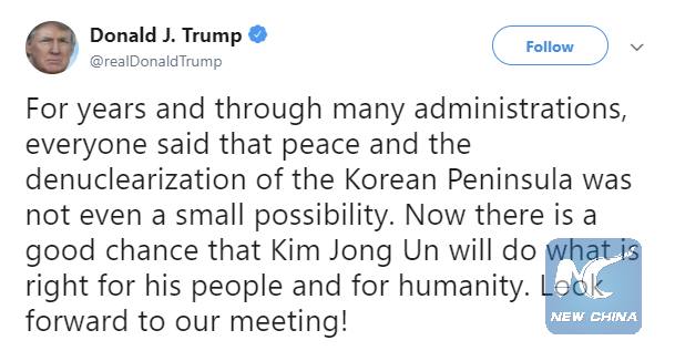 "For years and through many administrations, everyone said that peace and the denuclearization of the Korean Peninsula was not even a small possibility," Trump said, adding he looks forward to his meeting with Kim.