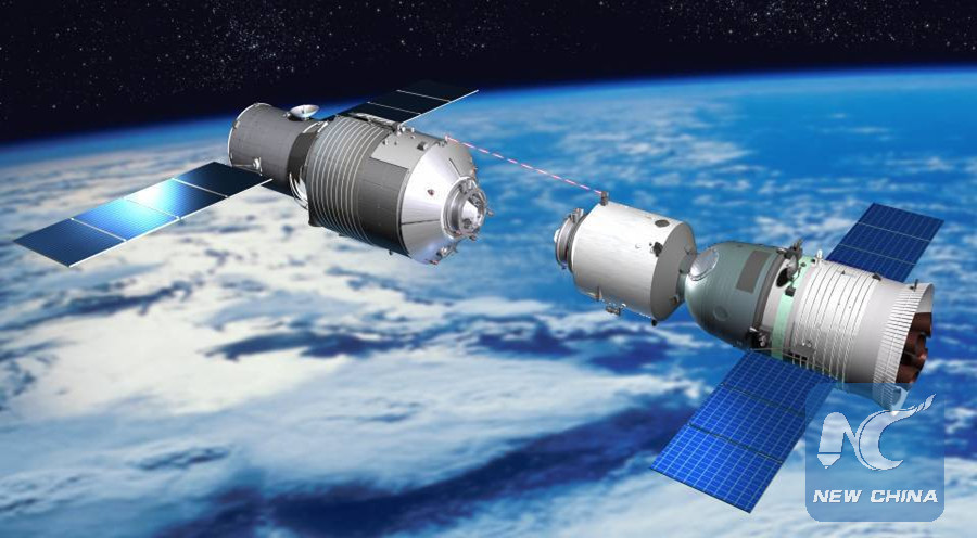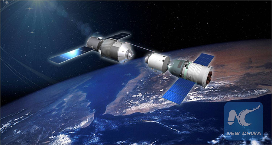 File photo provided by China Academy of Space Science shows a simulated picture of the space lab Tiangong-1 docking with Shenzhou-8 spacecraft. (Xinhua)