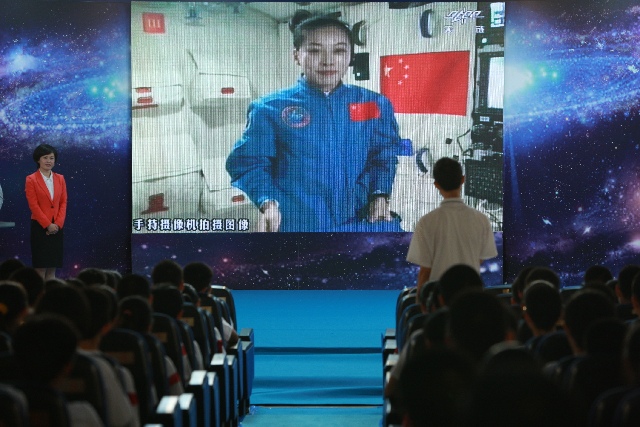 A student asks questions to female astronaut Wang Yaping, who is aboard Tiangong-1 space lab module, at the High School Affiliated to Renmin University of China, in Beijing, capital of China, June 20, 2013. (Xinhua/Wang Yongzhuo)