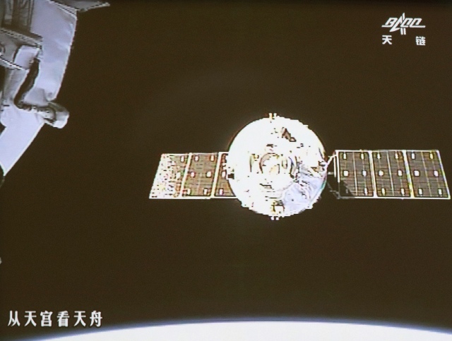 Photo taken on April 22, 2017 shows the Tianzhou-1 cargo spacecraft moving towards the orbiting Tiangong-2 space lab for the automated docking on a screen at Beijing Aerospace Control Center in Beijing, capital of China. (Xinhua/Wang Sijiang)