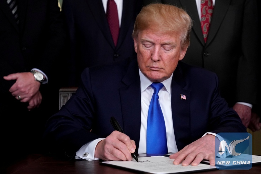 U.S. President Donald Trump signs a memorandum on potential tariffs on Chinese goods at the White House in Washington D.C., the United States on March 22, 2018. (Xinhua/REUTERS)