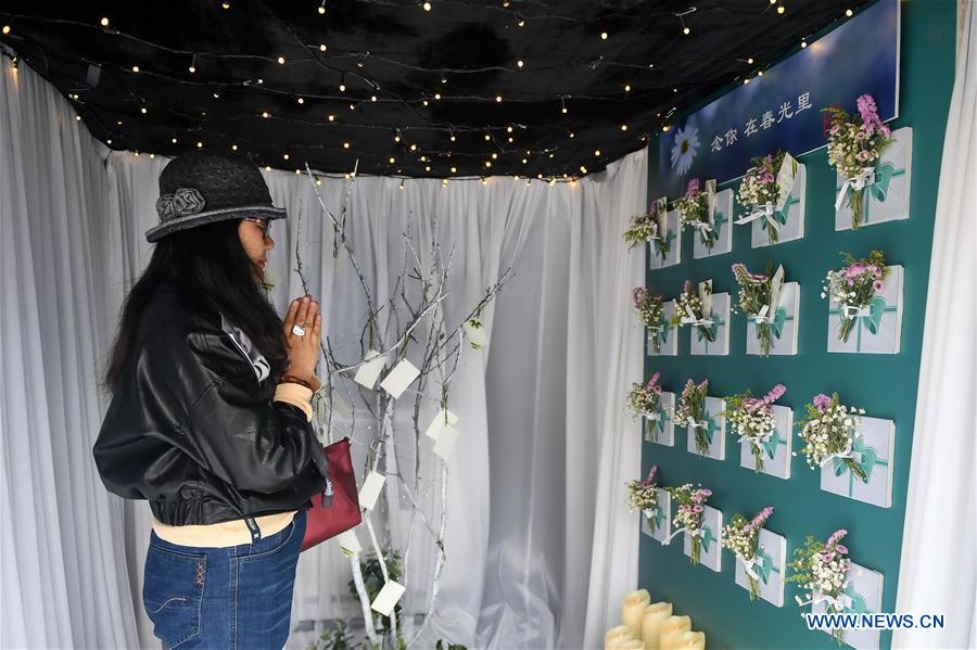 A mourner prays for the deceased inside a vehicle where people can write to the deceased in Changchun, northeast China's Jilin Province, April 4, 2018. The Chinese will remember and pay tribute to the deceased around the Qingming Festival, which falls on April 5. (Xinhua/Xu Chang)