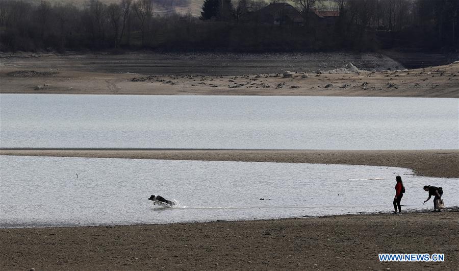 People play on the dried-up shore of the Lake of Gruyere near Bulle, Switzerland, on April 7, 2018. The level of the artificial lake of Gruyere was lowered by 20 meters, making room for the imminent fresh water coming down from the snow-covered Alps in the spring. (Xinhua/Ruben Sprich)