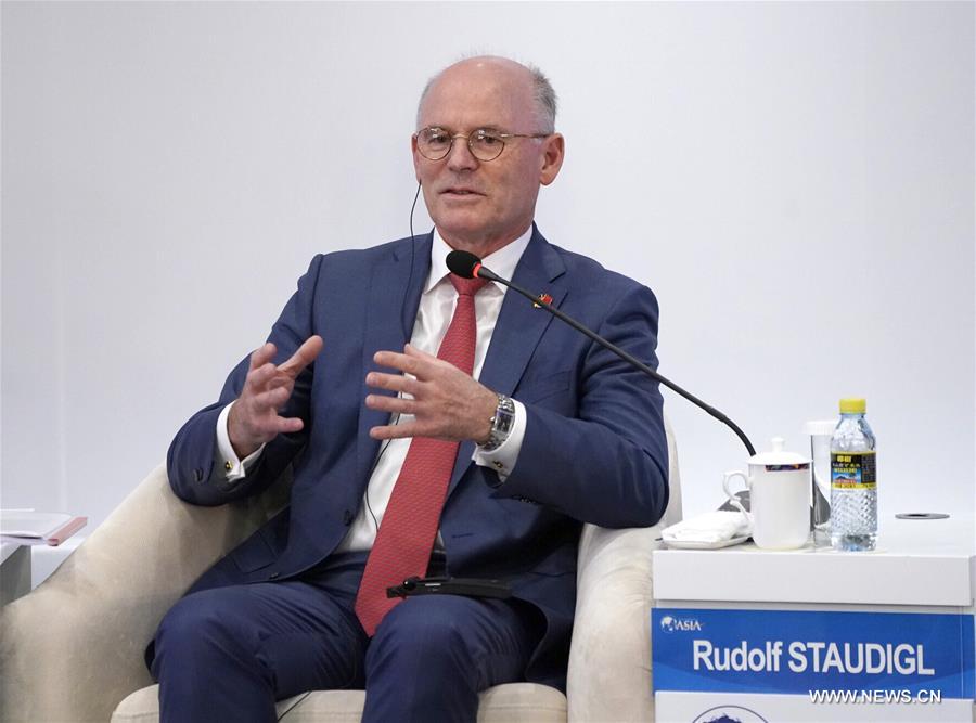 Rudolf Staudigl, president & CEO of Wacker Chemie AG, speaks at the session of "The Future of Production" during the Boao Forum for Asia Annual Conference 2018 in Boao, south China's Hainan Province, April 9, 2018. (Xinhua/Xing Guangli)