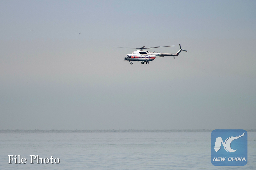 Photo taken on Dec. 27, 2016 shows a helicopter taking part in a rescue operation on the Black Sea coast at the crash site of Russian Defense Ministry's Tu-154 aircraft near Sochi, Russia. (Xinhua/Sputnik)