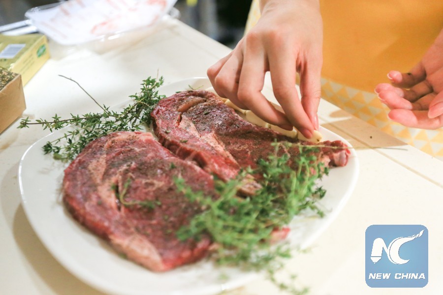 Photo taken on Nov. 2, 2017 shows a local resident marinating beef that imported from the United States, in Shanghai, east China. (Xinhua/Meng Dingbo)