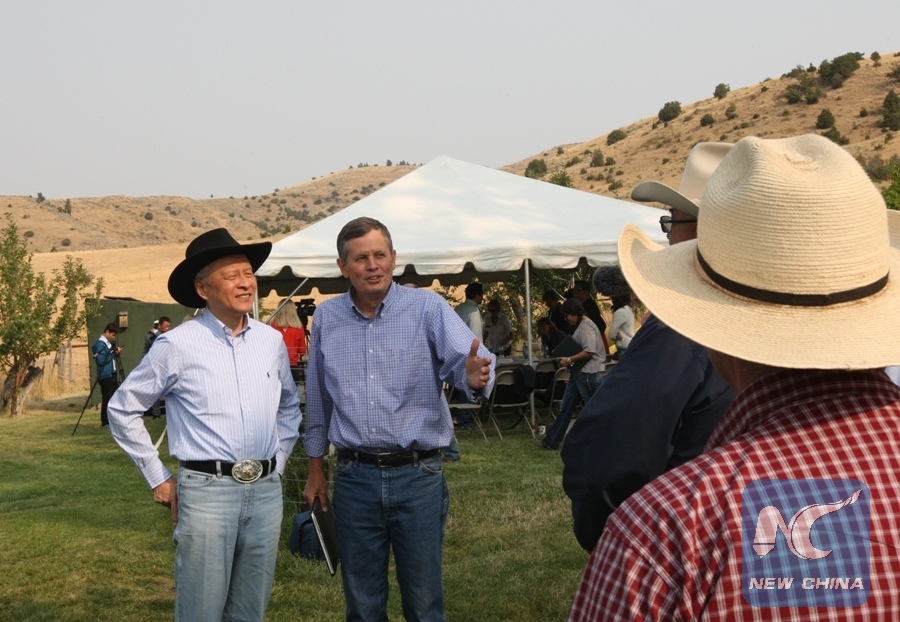 File photo shows that Steve Daines (2nd L), a senator from U.S. state of Montana, and Cui Tiankai (1st L), Chinese Ambassador to the United State, speaks with Fred Wacker and other cattle ranchers at the Morgan Ranch House, near downtown Bozeman, Montana, the United States, on Sept. 8, 2017. (Xinhua/Yan Liang)