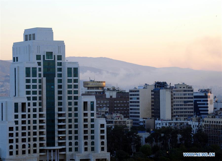 Smoke is seen from a distance in the Syrian capital Damascus on April 14, 2018. (Xinhua/Ammar Safarjalani)