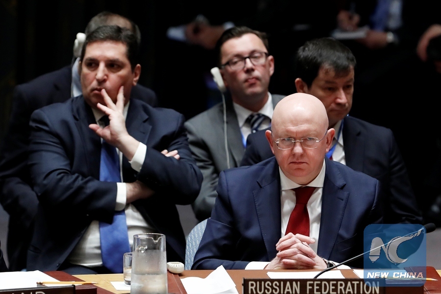 Russian Ambassador to the United Nations Vassily Nebenzia (Front) attends a Security Council emergency meeting on Syria at the UN headquarters in New York, April 14, 2018. UN Security Council held an emergency meeting on Syria requested by Russia on Saturday. UN Secretary-General Antonio Guterres expressed concern over Friday's joint military action against Syria by the United States, France and Britain, and called for adherence to the UN Charter and international law on the issue. (Xinhua/Li Muzi)