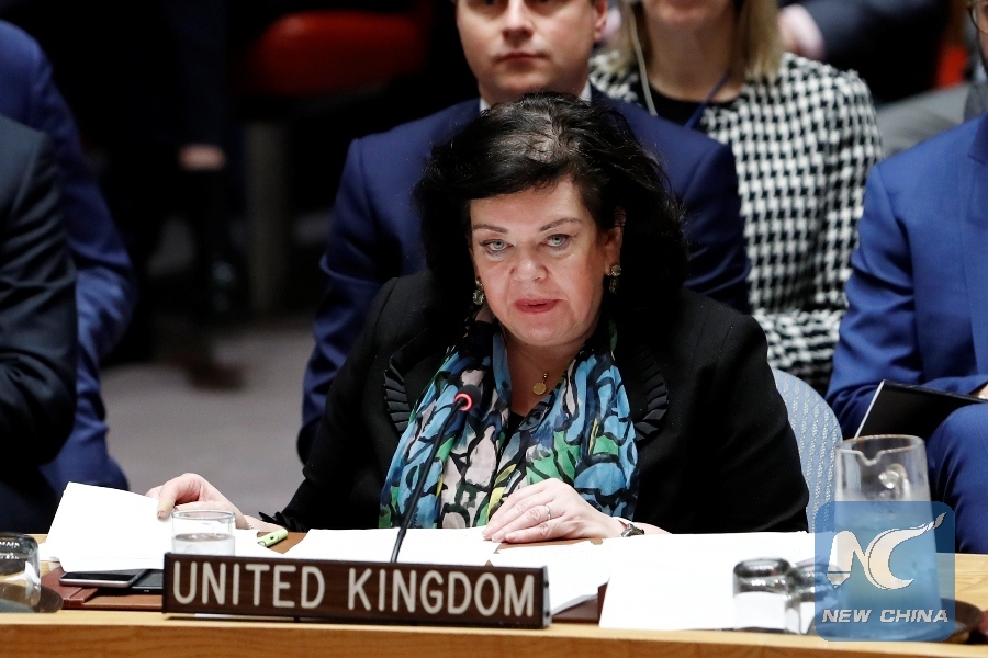 British Ambassador to the United Nations Karen Pierce (Front) addresses a Security Council emergency meeting on Syria at the UN headquarters in New York, April 14, 2018. (Xinhua/Li Muzi)