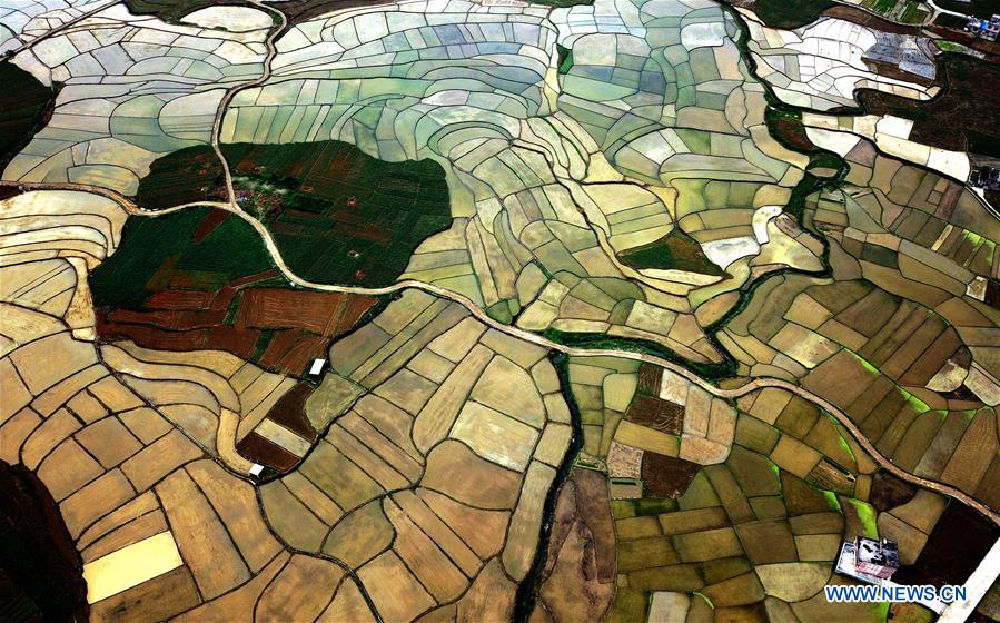 Aerial photo taken on April 16, 2018 shows the paddy fields at Longkou Village under Dahua Township in Yao Autonomous County of Dahua, south China's Guangxi Zhuang Autonomous Region. (Xinhua/Zhang Ailin)