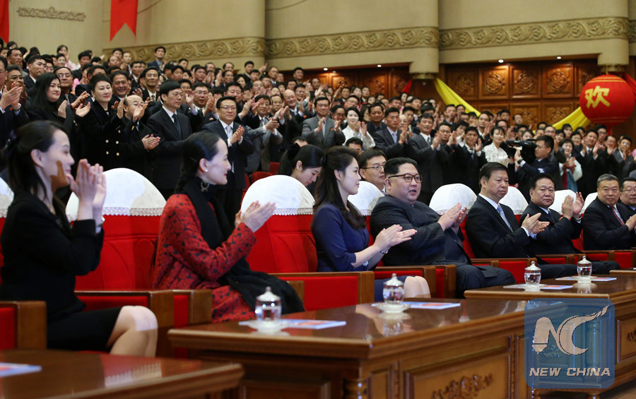 Kim Jong Un, top leader of the Democratic People's Republic of Korea, and his wife Ri Sol Ju watch the ballet "The Red Detachment of Women" performed by a visiting Chinese art troupe in Pyongyang, the Democratic People's Republic of Korea, April 16, 2018. (Xinhua/Yao Dawei)