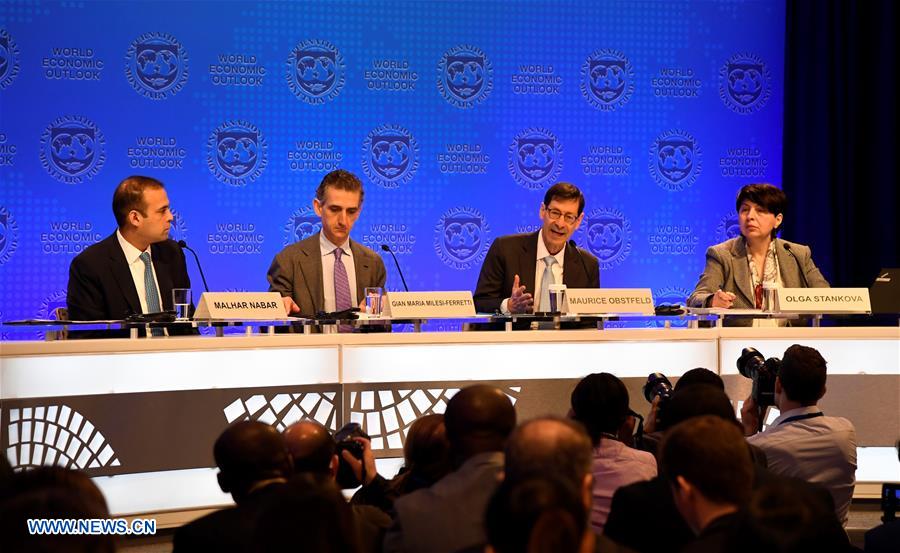 Maurice Obstfeld (2nd R), Economic Counsellor and Director of Research at the International Monetary Fund (IMF), speaks on the newly-released World Economic Outlook in Washington D.C., the United States, April 17, 2018. The International Monetary Fund on Tuesday kept its growth forecasts for the world economy unchanged for this year and next year, but warned that a potential broad-based trade conflict threatens to derail global growth prematurely. (Xinhua/Yang Chenglin)